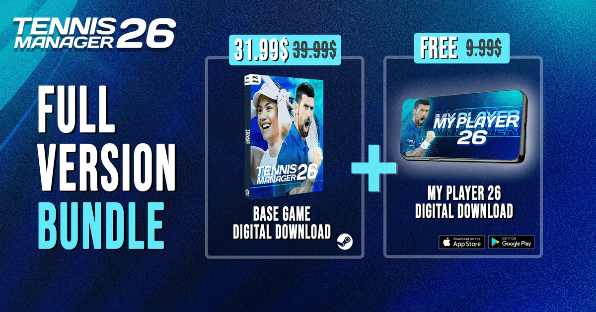 Get the best of Tennis Manager on every screen: Tennis Manager 26 on PC (Steam) and My Player 26 on mobile (iOS/Android).